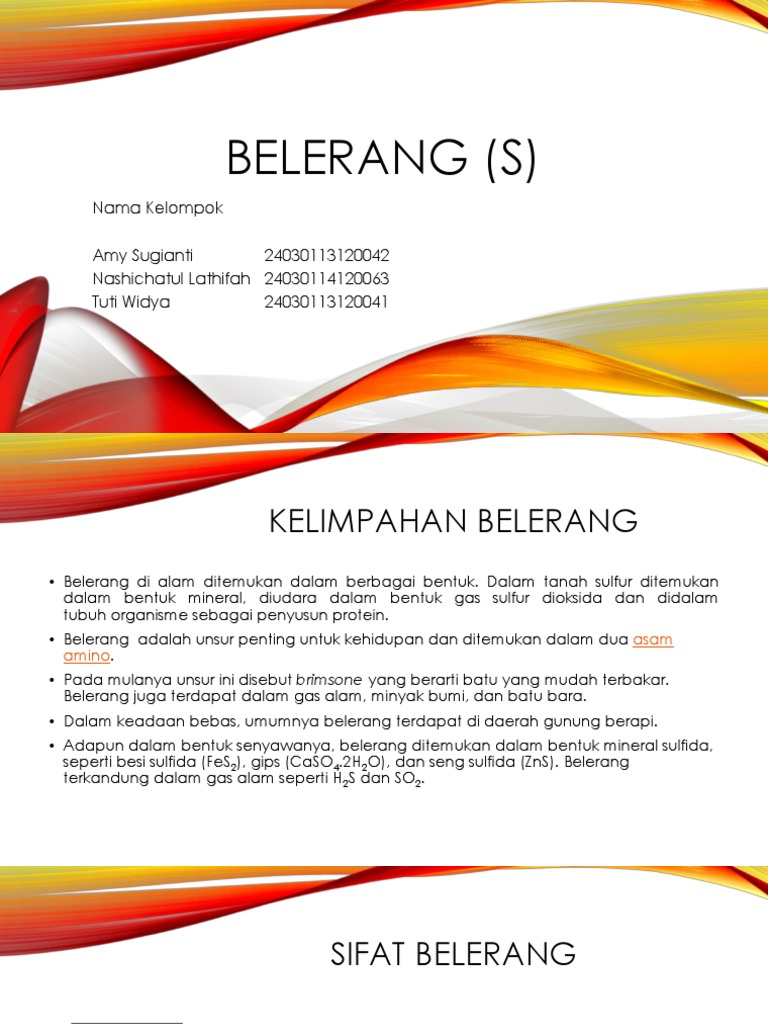 Belerang bersifat mudah terbakar dan menghasilkan gas belerang dioksida (so2). Logam natrium lebih reaktif dibandingkan logam magnesium, sehingga larutan naoh bersifat lebih basa dibandingkan larutan mg(oh)2.padatan naoh lebih mudah larut dalam air. Belerang dioksida adalah gas yang tak berwarna, berbau sengat, agak mudah larut dalam air. Belerang atau sulfur didapatkan dalam 2 endapan belerang ini terbentuk oleh kegiatan solfatara, fumarola,atau sebagai akibat dari gas dan kalsium sulfur, ammonium sulfat, karbon disulfida, belerang dioksida dan asam sulfida adalah. Dampak penggunaan belerang belerang bersifat mudah terbakar yang menghasilkan gas belerang dioksida.